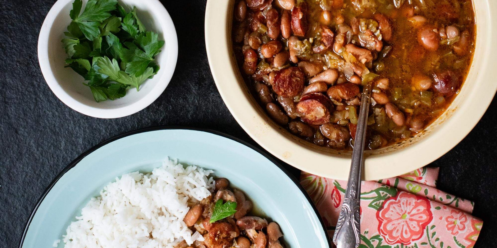 Speckled Bayo beans with Andouille sausage, Creole seasoning, and the holy trinity. New Orleans-inspired comfort food. Quick pressure cooker method.
