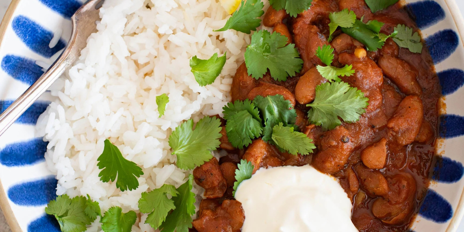 Comforting Indian bean curry with Speckled Bayo beans and aromatic spices. Rich, warming rajma by Anisha Chandra. Better than coming home.