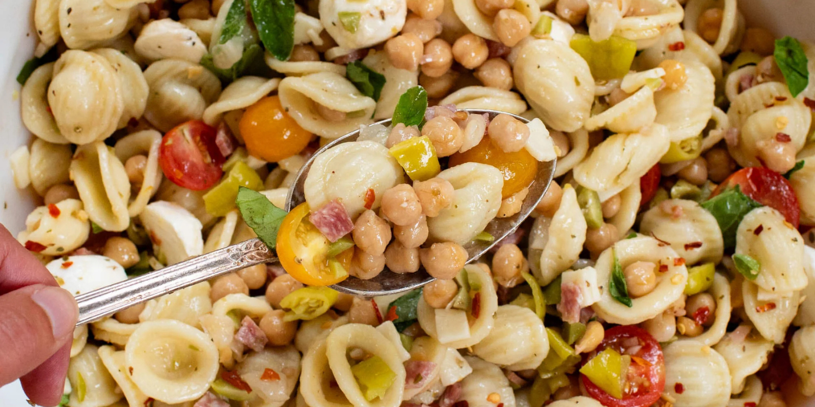 Italian hoagie flavors transformed into pasta salad. Chickpeas, salami, pepperoncini, mozzarella, and zesty dressing. Summer potluck winner.