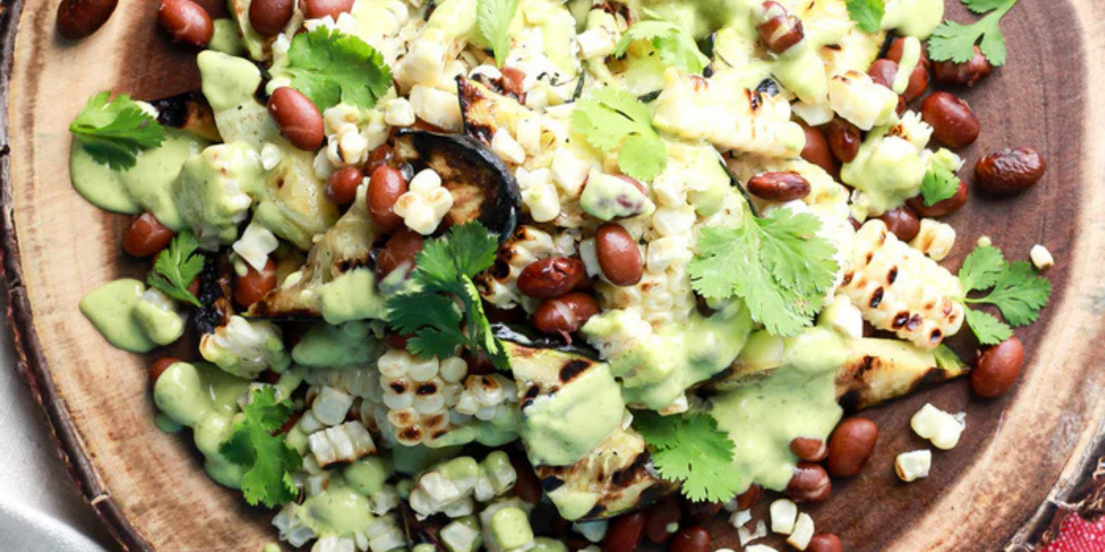Grilled corn, zucchini, and Southwest Red beans with creamy avocado dressing. A vibrant salad honoring the Three Sisters tradition.