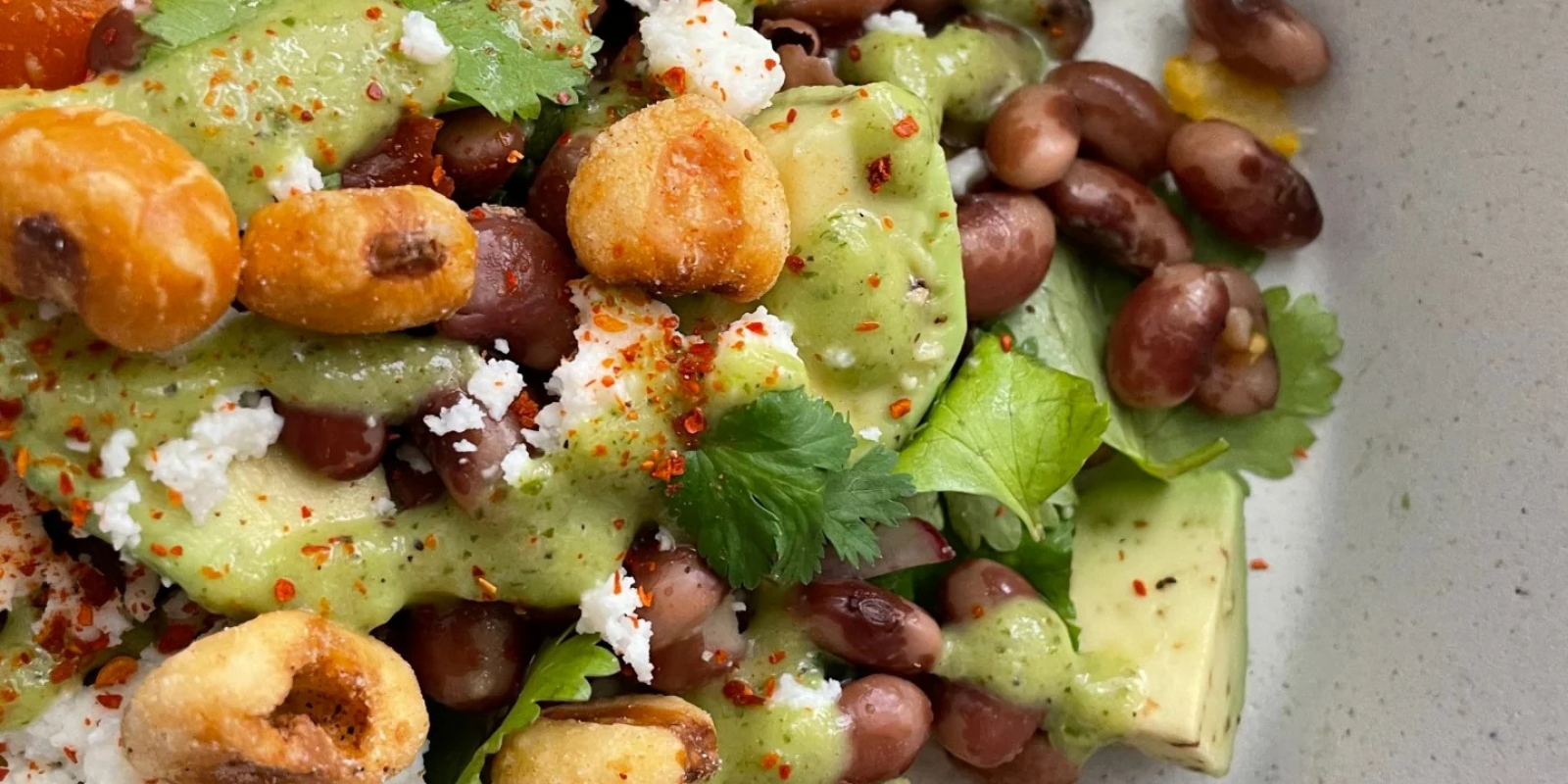 Bright Southwest Red beans with tomatillo dressing, toasted hominy, and fresh vegetables. A vibrant salad that celebrates regional flavors.