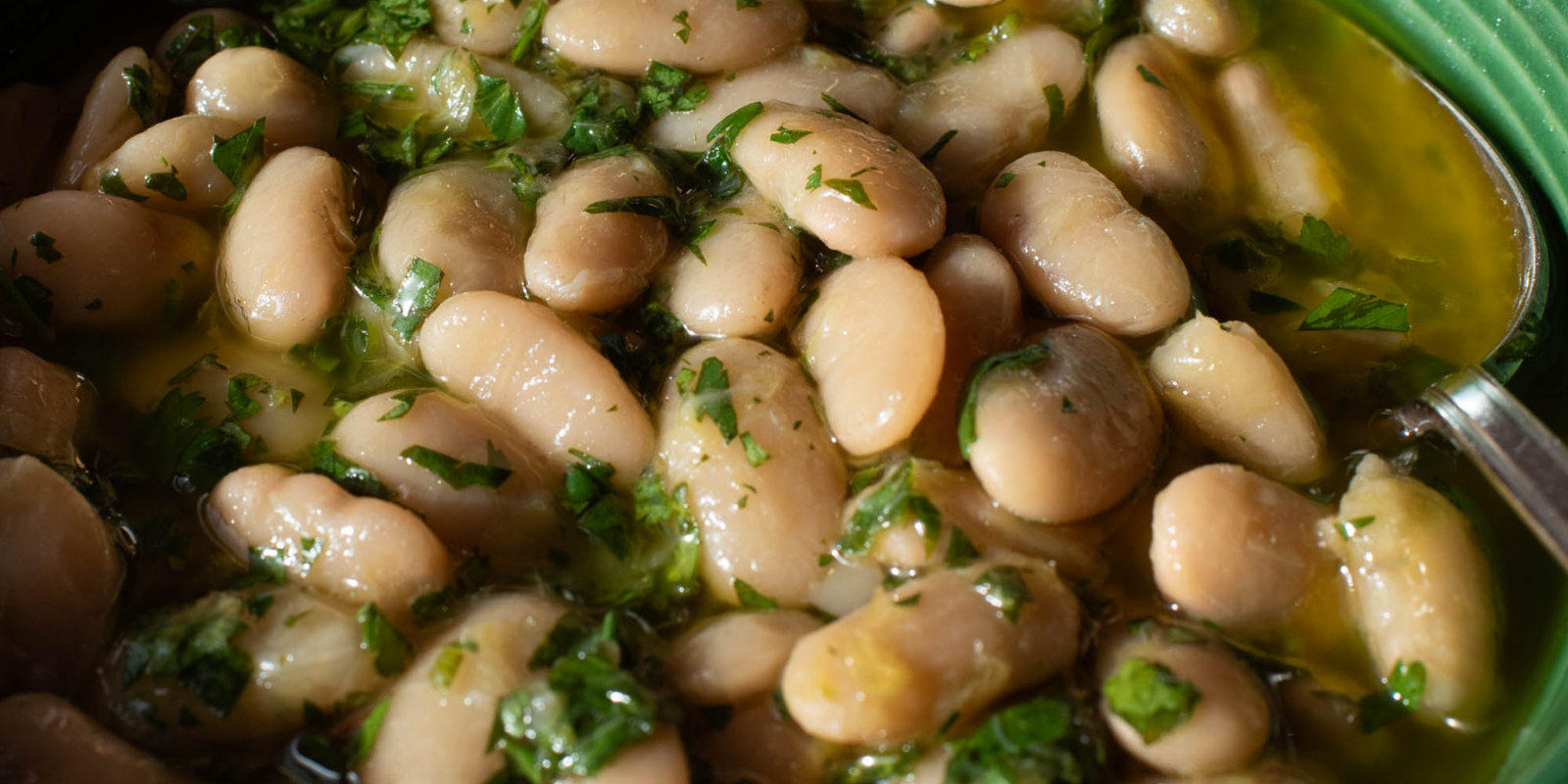 Creamy beans topped with vibrant Italian salsa verde. Simple, fresh springtime meal from our collaboration with Scopus Vineyard.