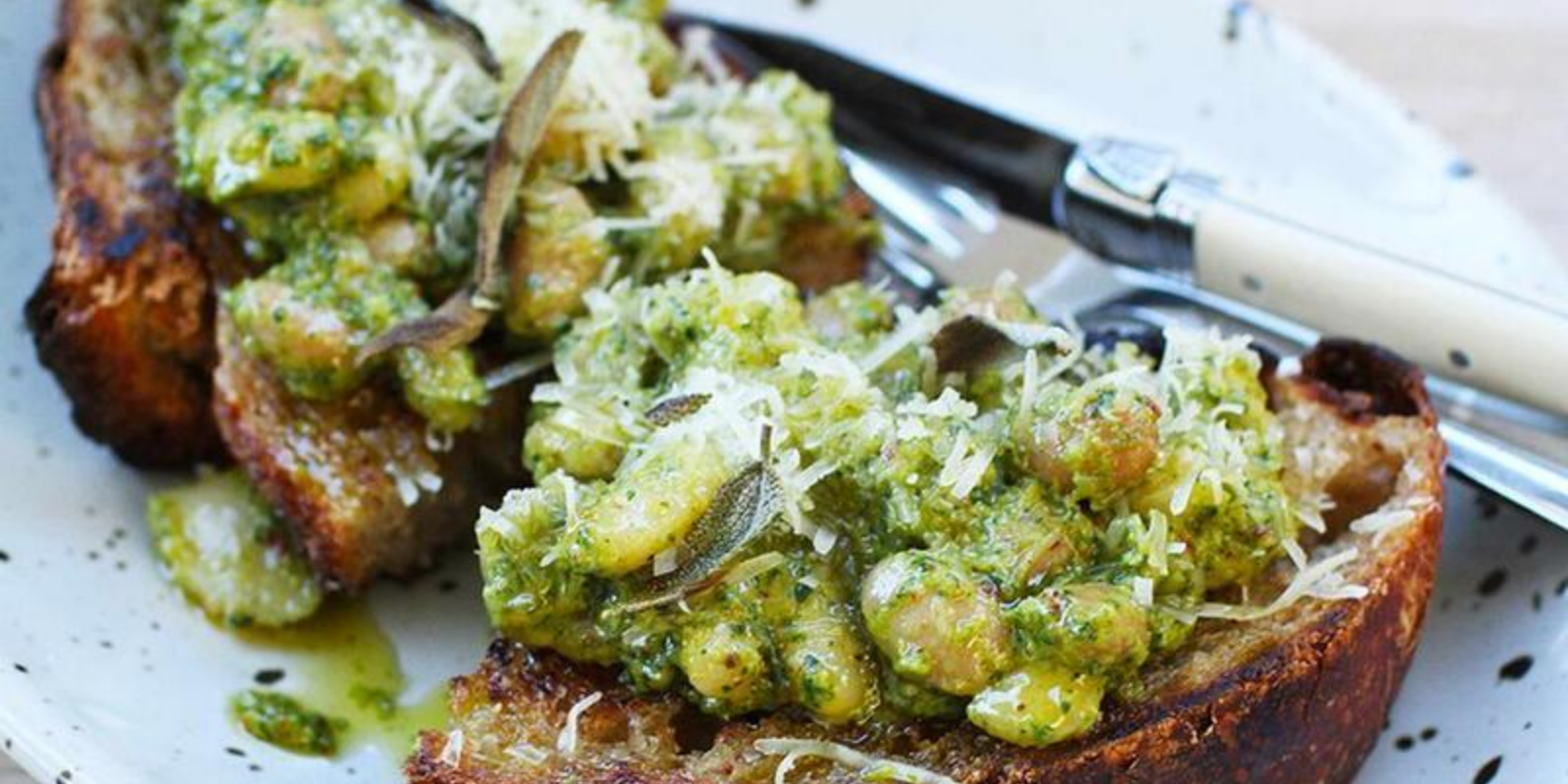 Creamy Cranberry beans topped with vibrant sage-pistachio pesto on crispy toast. A stunning vegetable-forward dish from LA's Botanica restaurant.