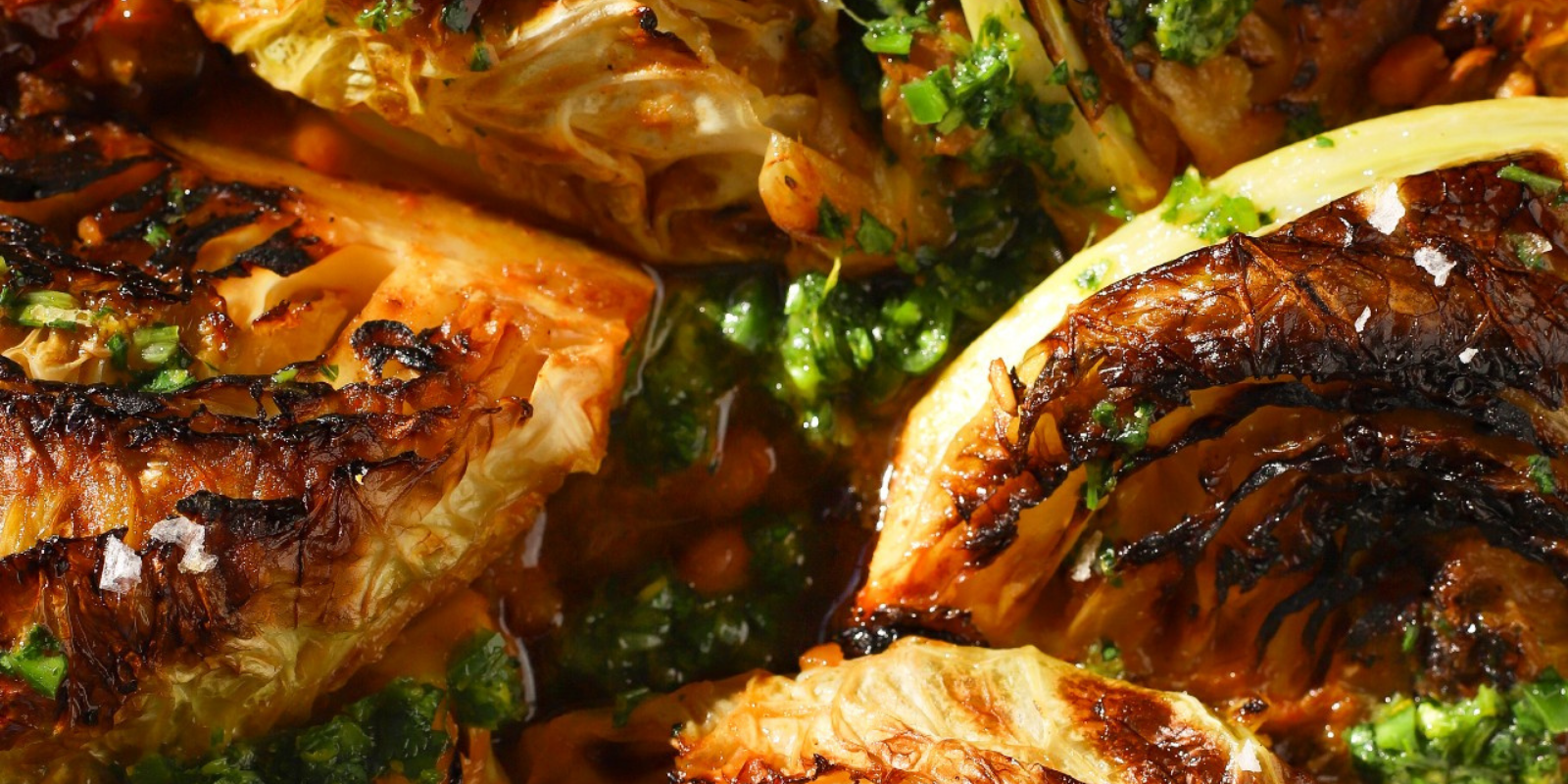 Flor de Mayo beans braised with Diaspora Co. Hawaij Masala and caramelized cabbage wedges. Warming spices, bright herb sauce. Asha Loupy collaboration.