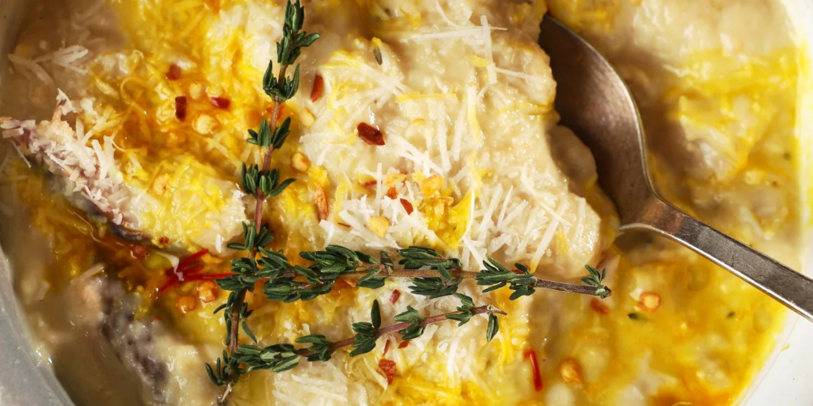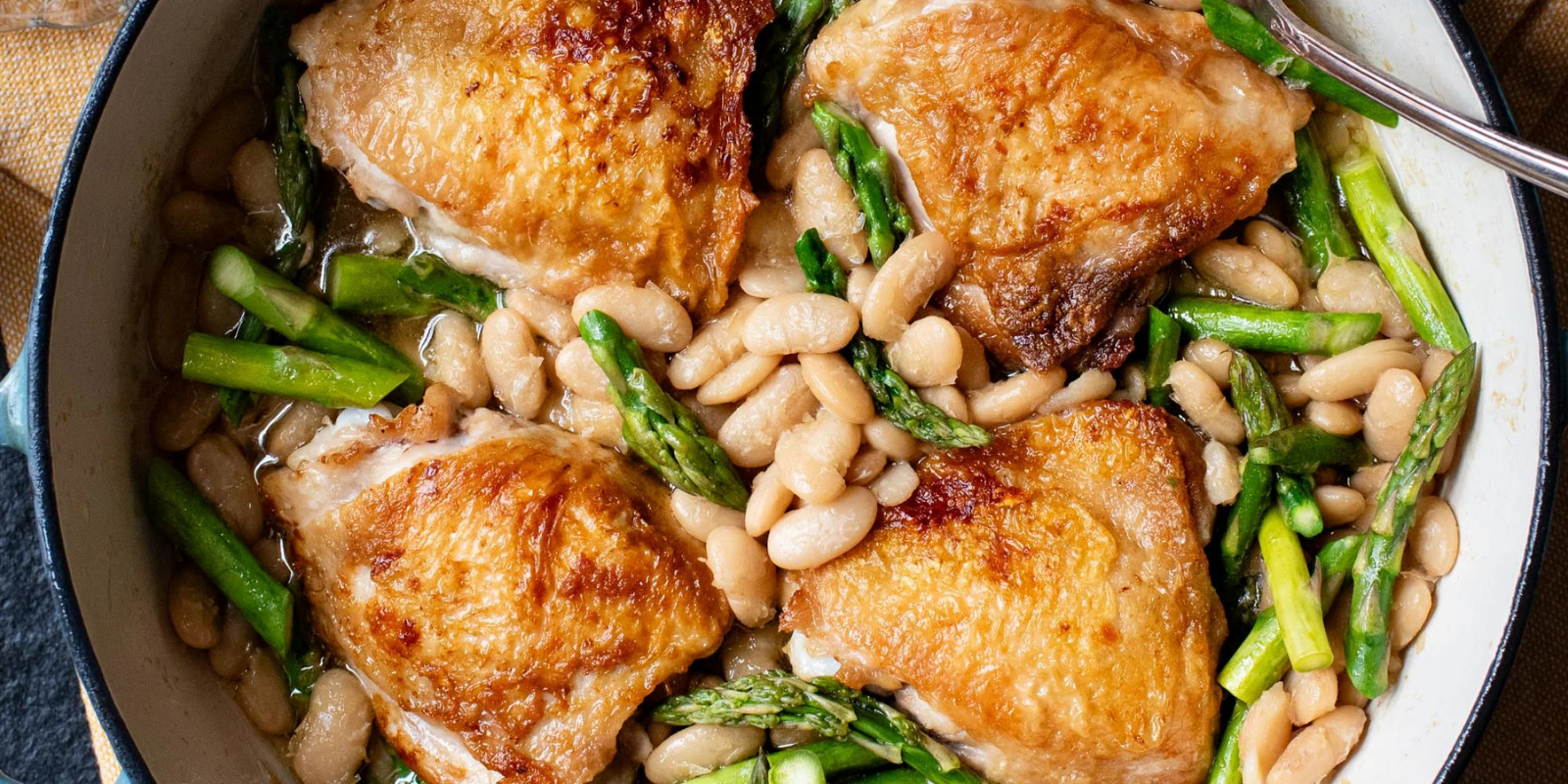 One-pot meal with crispy chicken, Classic Flat White beans, and asparagus. Rich, savory, impressive. Works with any seasonal vegetable.