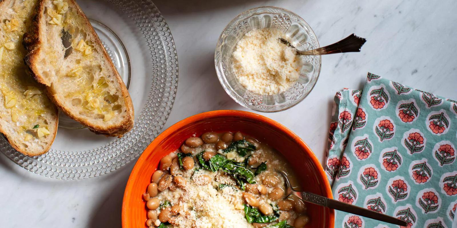 Peruano beans with kale, garlic, and chicken stock. Simple, hearty comfort food. Great Jones partnership recipe for cozy nights in.