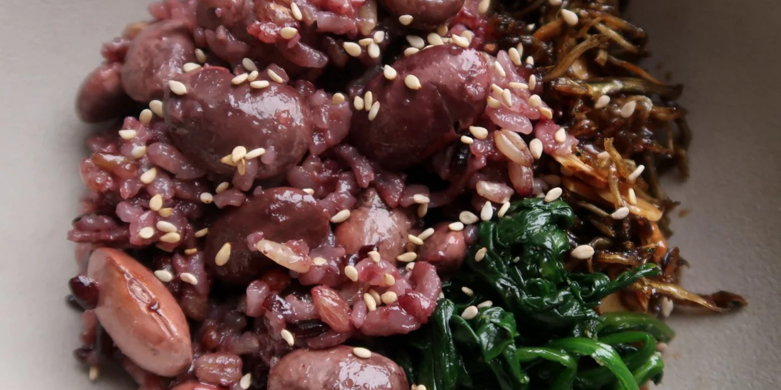 Korean rice and beans with Ayocote Morado, three rice varieties, and sesame. Summer staple by Alex. Satisfying without being heavy. Perfect leftovers.