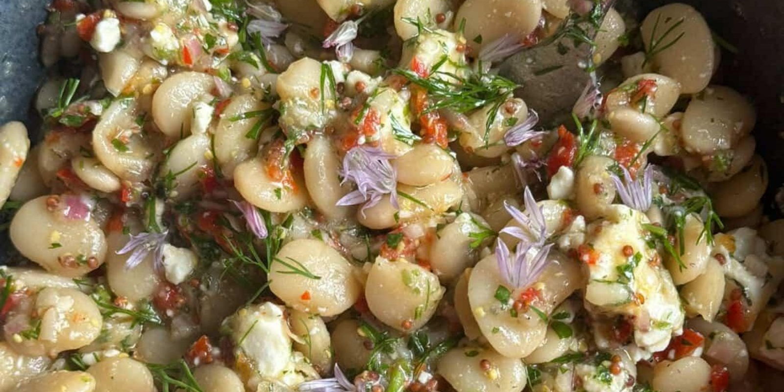 Tangy, herby summer bean salad with Peppadew peppers, feta, and fresh herbs. Baby Butter beans in bright vinaigrette by Rae Friedman.