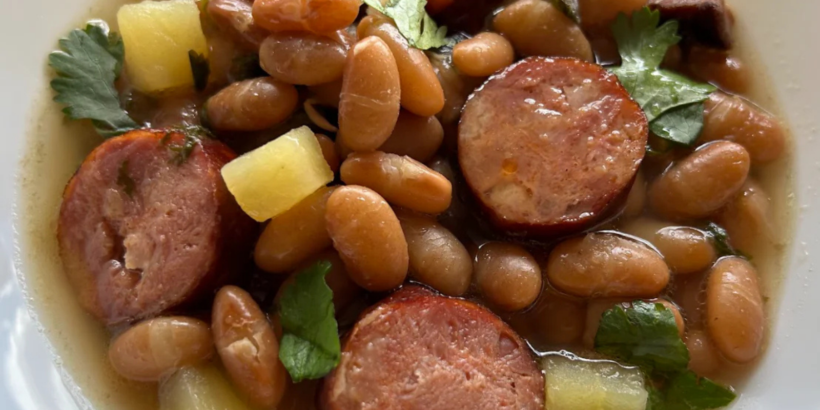 Portuguese stone soup with Peruano beans, chouriço, and toucinho. Folktale-inspired comfort food by Jennifer Borges. Hearty and traditional.