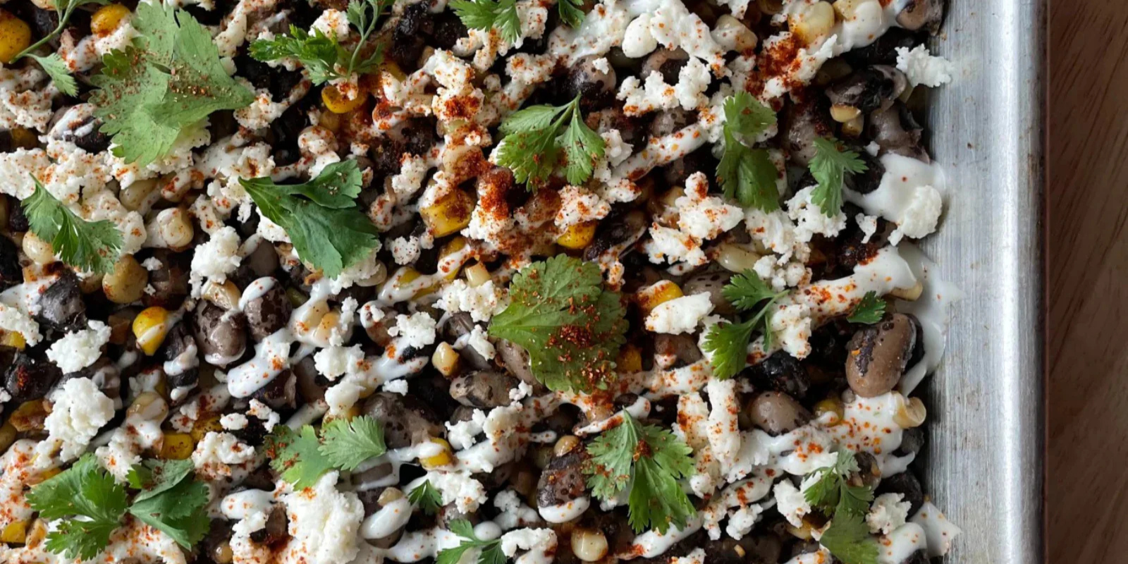 Orca beans with charred corn, cotija, and tangy mayo dressing. Street corn flavors meet hearty beans. Jackie Young's colorful twist on elote.