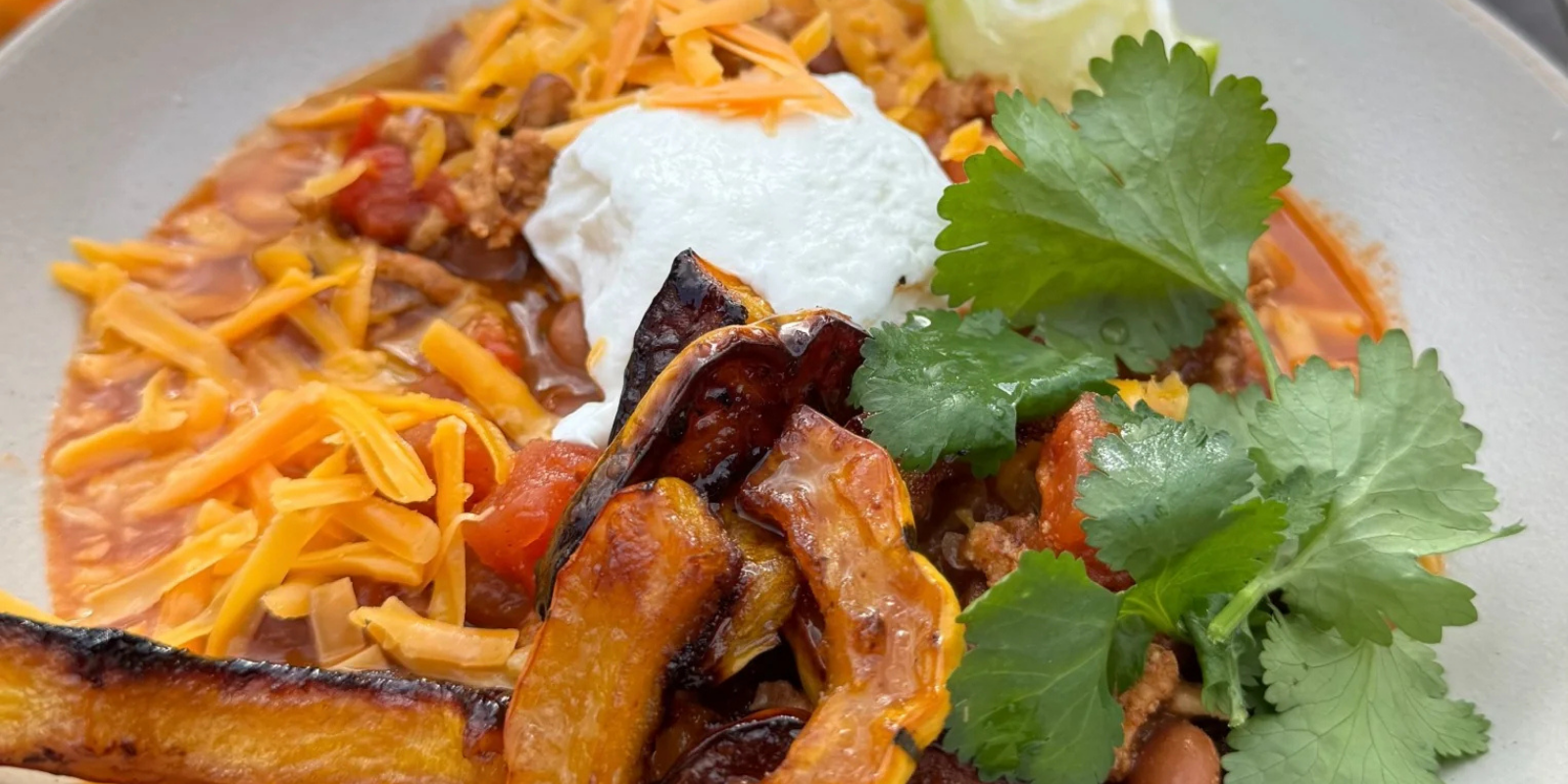 Hearty turkey and bean chili with roasted delicata squash. A warming, flavorful dish perfect for cold days and gathering around the table.
